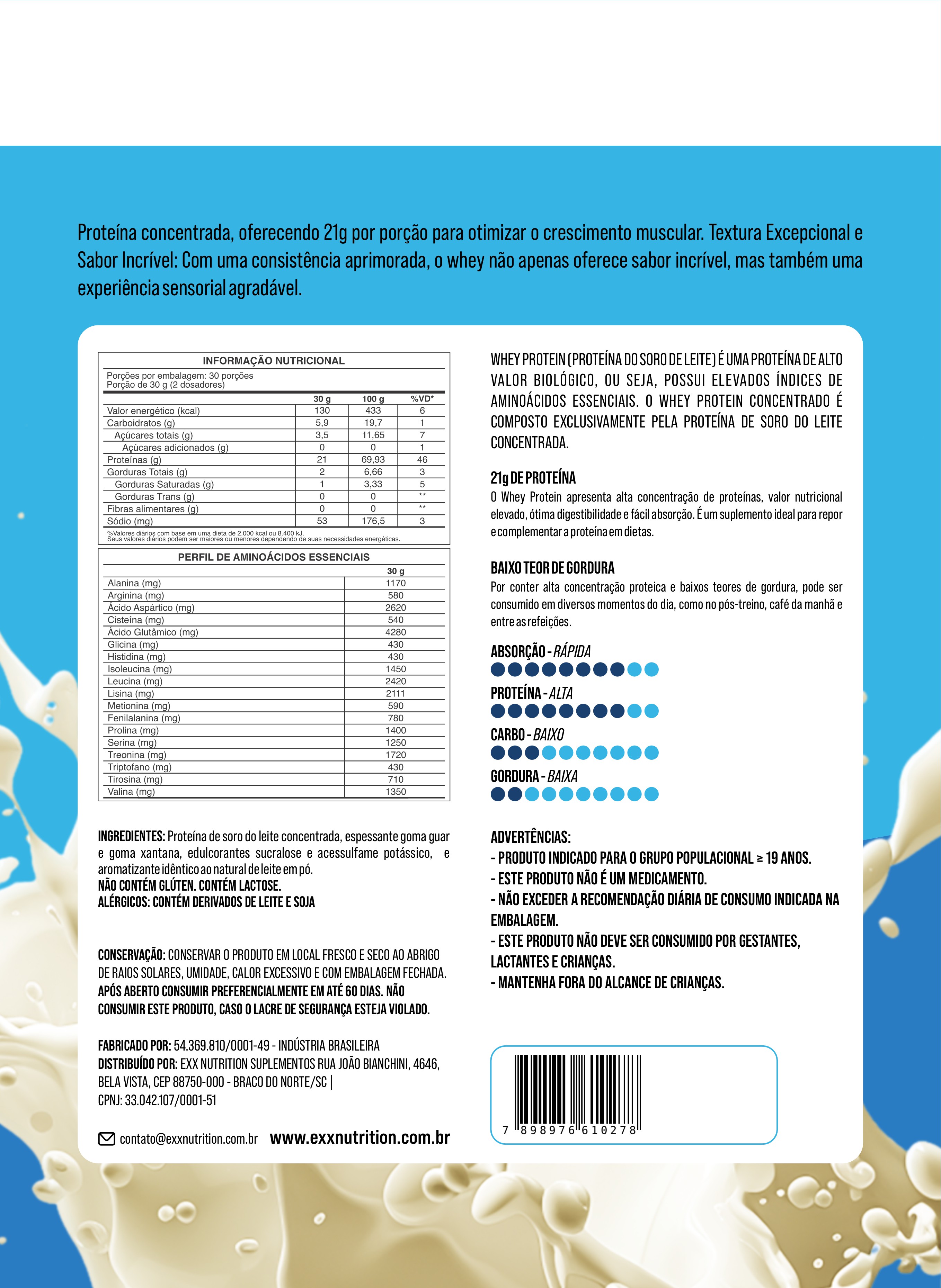Produzido exclusivamente a partir da proteína do soro do leite concentrada, ele oferece alto valor biológico, excelente digestibilidade e um perfil completo de aminoácidos essenciais.